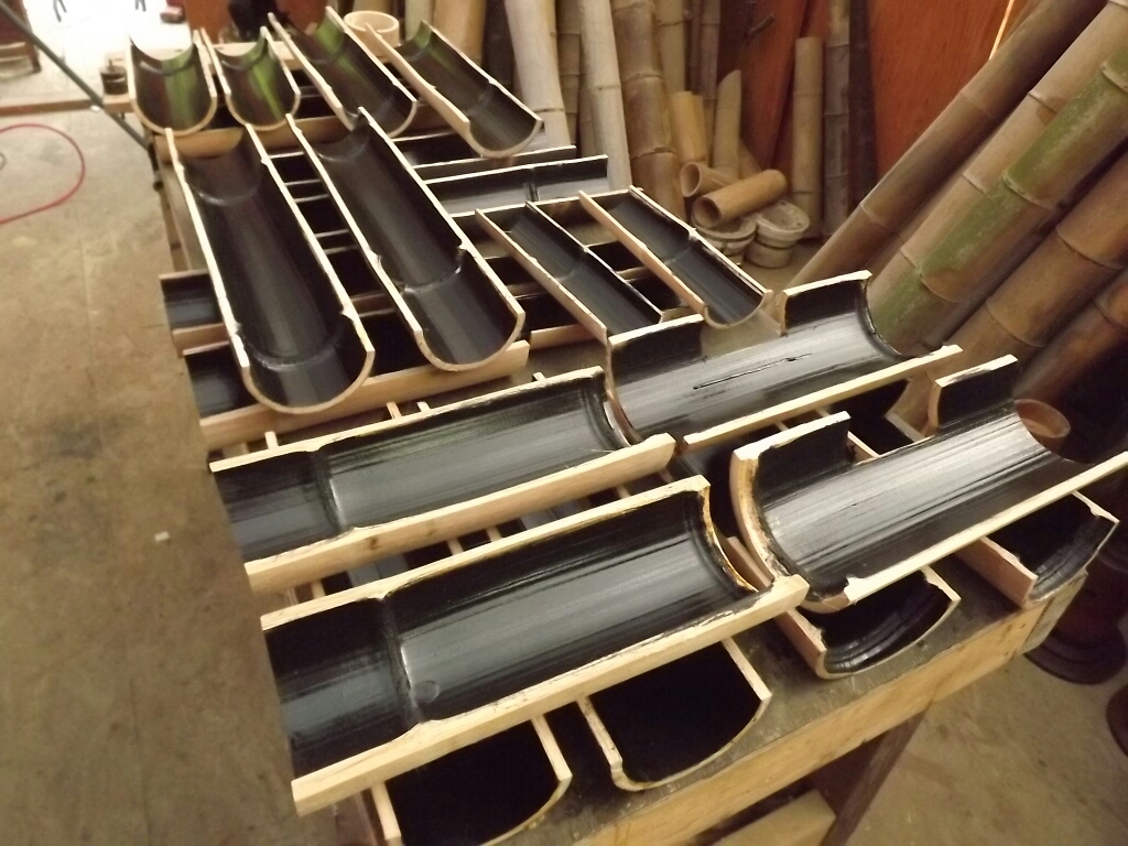 竹スピーカーの内側は漆塗りになっています、竹はどんなに乾 燥させてもスポンジのように水分を吸います 乾燥と湿気の繰り返しで膨らんだり萎んだりするので割れやカ ビの発生の原因になります。これを回避するために 内部を漆でコーティングします。楽器と同じで湿気の多いとき と乾燥状態の時では音が違ってきます。 安定した音のために内部を漆塗りして表面はシェレックニスで 固めます。天然の素材を使用した完全防水です。 この作業は絶対に省けない工程です。