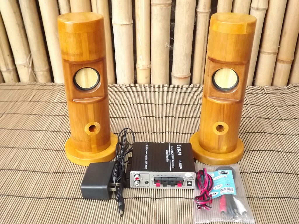 デスクトップでも使用できる、小振りのバンブースピーカーです。振動板は100%竹の板を使用しています。